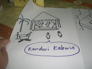 Masa training kat Pusat Latihan UiTM Tg Tualang baru-baruni kan, untuk sessi malam hari, kami kena buat aktiviti yang tak pekdah ni. Buat satu storyboard tentang keusahawanan dan kemudian kena lakonkan! Eeeii...gilo! i paling nyampah tahap muntah kalau nk kena menggedik-gedik atas pentas tau. konon nk selamatkan diri (i tamau belakon) i offer diri untuk jadi pelukis. Tapi akhirnya i kena jugak belakon sbb tak cukup pelakon (terlebih watak kekdahnya! uwaaaa... mencik!)